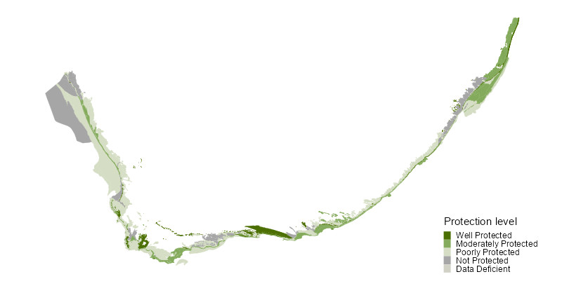 Ecosystem protection level was determined by calculating the proportion of each ecosystem type in a protected area, and evaluating these against a predefined biodiversity target per ecosystem type, with heuristics regarding the ecological condition of the ecosystem types under protection. Ecosystem types are assigned one of four categories of protection: Well Protected - biodiversity target is met; Moderately Protected - at least half the biodiversity target is met; Poorly Protected - more than 5% of the biodiversity target is met, and Not Protected - less than 5% of the biodiversity target is met.