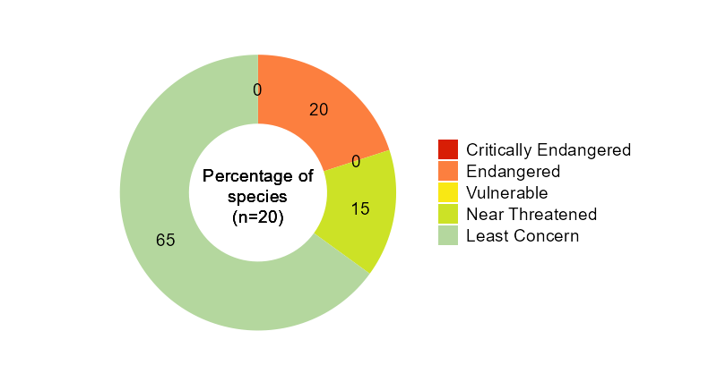 Species assessments are included in the Coast Assessment for the first time. As a first step, the threat status of 20 sandy beach invertebrates was assessed, with 1 in 5 species assessed as Endangered. A further 3 species were assessed as Near Threatened (Figure 9).