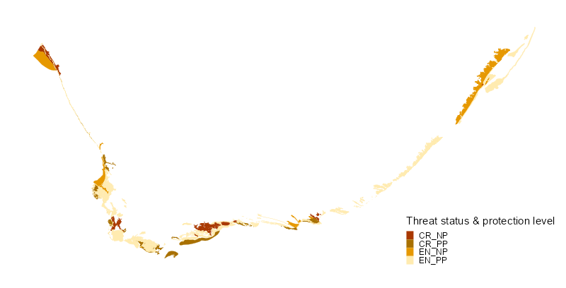 The ecosystem types that are at highest risk of loss can be identified by intersecting the results of the ecosystem threat status and protection level analyses, and sub-setting the results to the most threatened and most under-protected ecosystem types (Table 1).