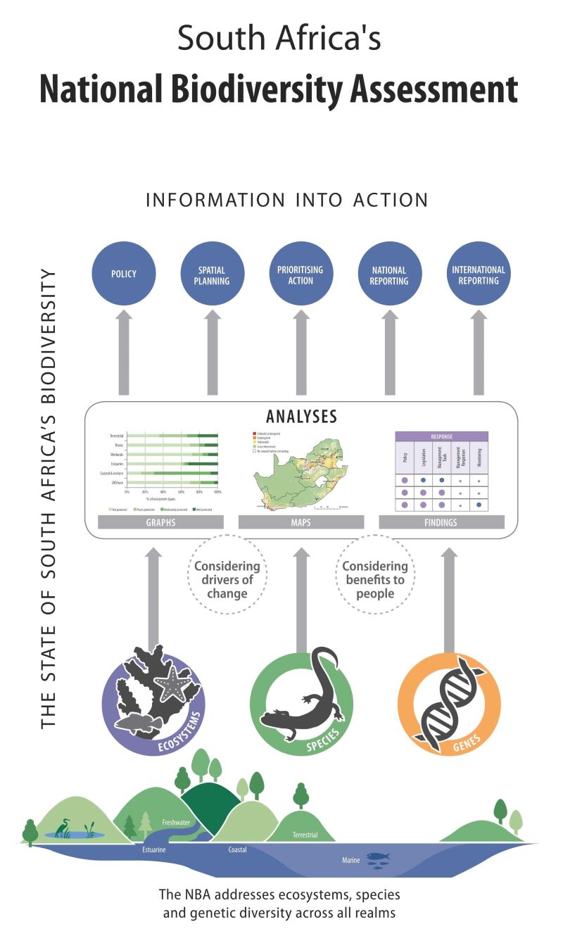 The scope of the NBA is broad, assessing biodiversity at the ecosystem and species level, and addressing aspects of genetic diversity. The assessment covers all of South Africa’s territory, across land and sea, including its subantarctic territory of the Prince Edward Islands. Information is organised by realm (terrestrial, freshwater (rivers and inland wetlands), estuarine and marine (benthic and pelagic)), and the cross-ream coastal zone and the subantarctic region.