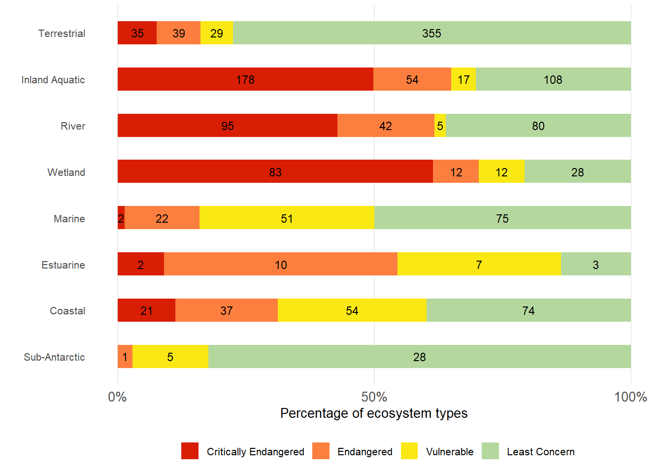 Protection Level is an indicator developed in South Africa that measures the representation of ecosystem types within the protected area network. The extent of each ecosystem type within the network is expressed as a proportion of the total extent. Four categories of Ecosystem Protection Level are calculated per ecosystem type (n= 22).