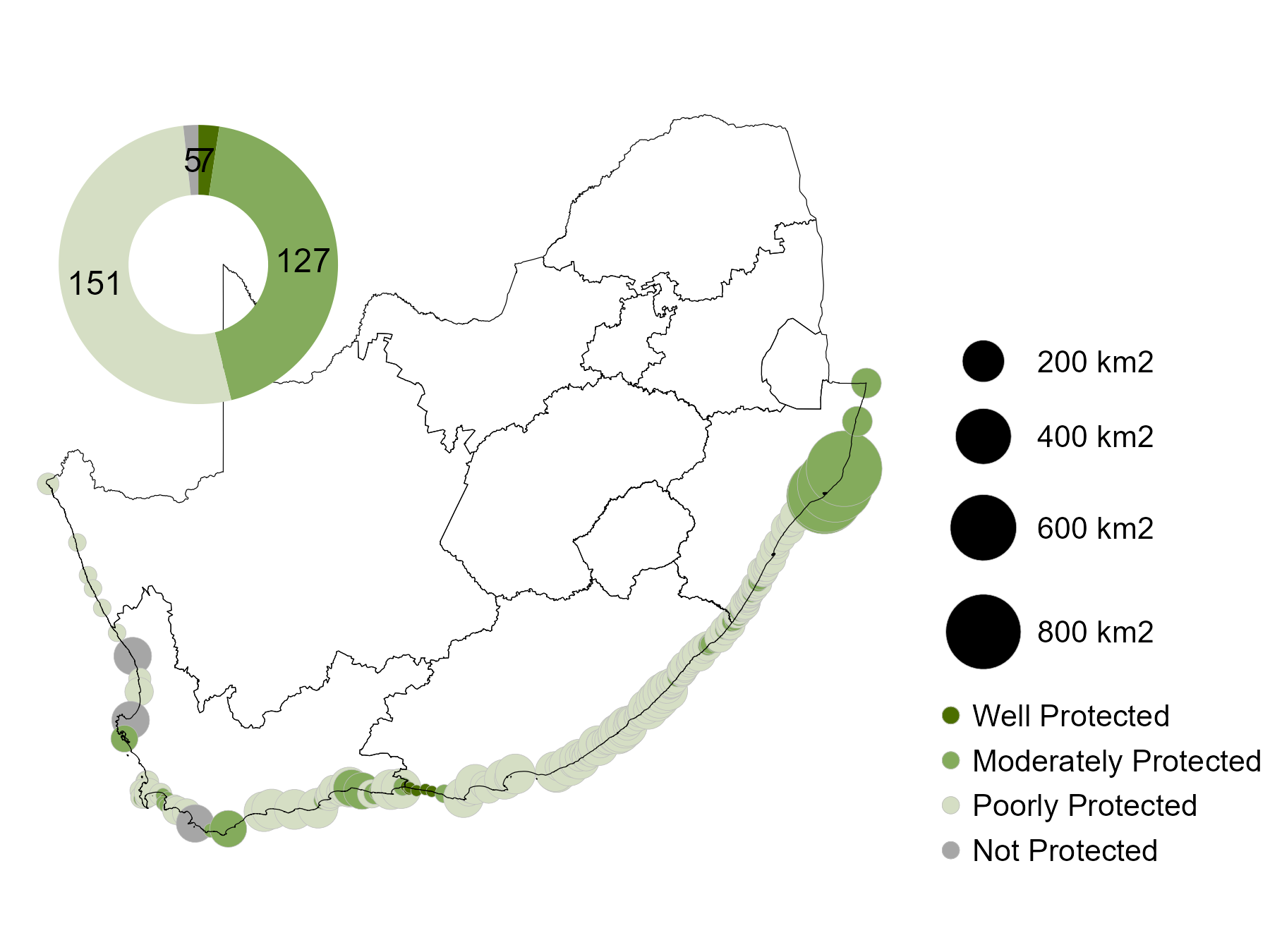 Overall, estuaries are Moderately (59%) to Poorly (32%) protected in South Africa, less than 1% of area is well protected. From an ecosystem types perspective about 9% are Well protected, 36% Moderate, 41% Poorly, and 14% Not Protected.
