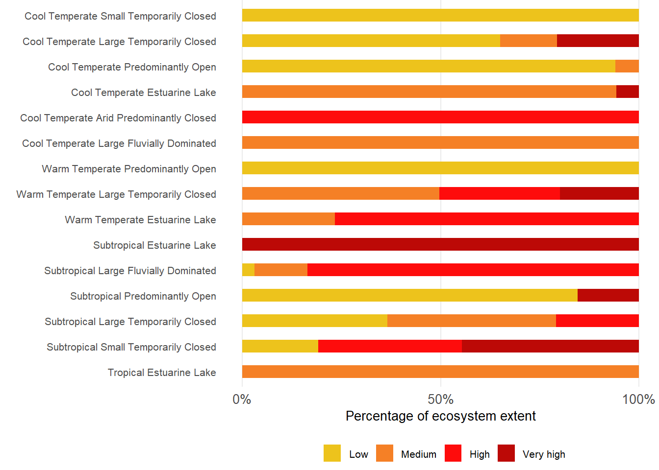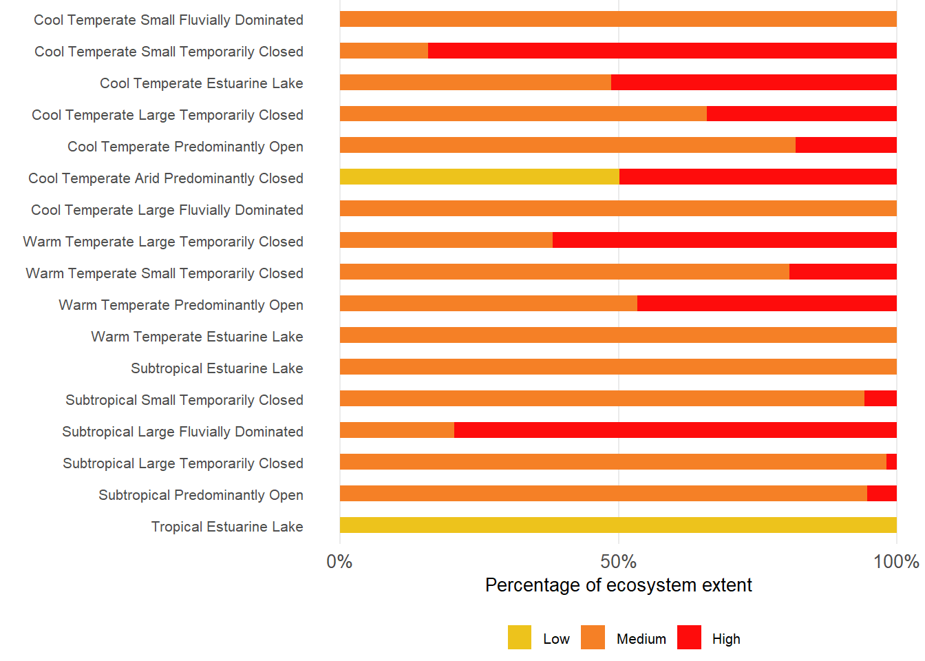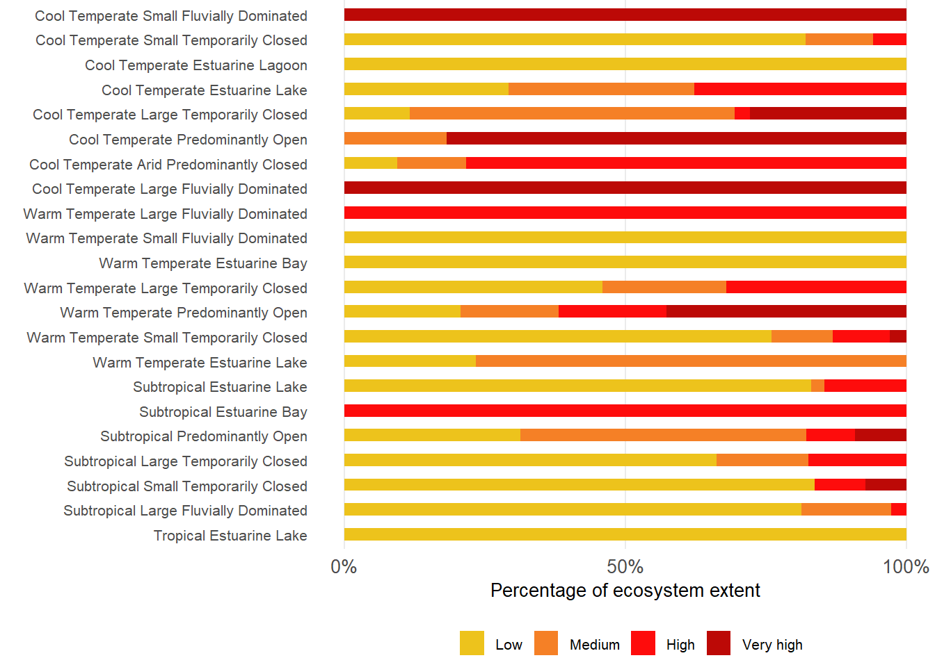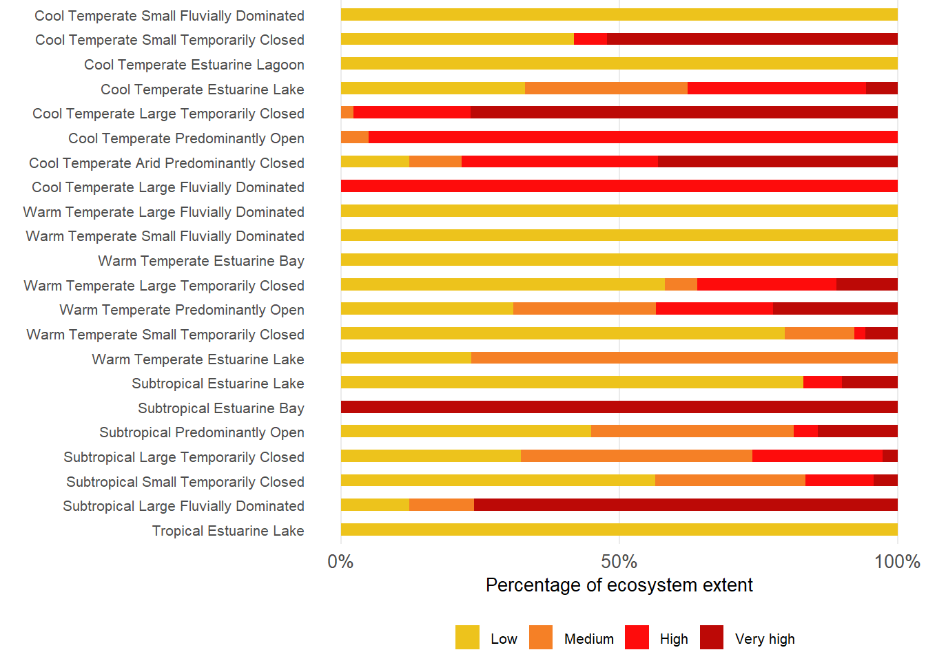 About 35% of estuarine extent are under severe pressure from alien or extralimital fish invasion, mostly in Temperate regions. About 76% and 65% of Warm and Cool Temperate regions respectively, are subjected to severe levels. Less than 60% of area remains unaffected by alien or extralimital fish invasion, mostly in the Tropical region. Severe pressures are most prevalent in Predominantly Open, Estuarine Bays, Large Temporarily Closed; Large Fluvially Dominated, Large Temporarily Closed and Estuarine Lake types.