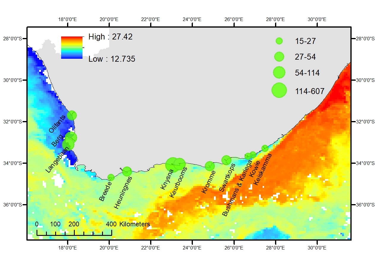 Settlement of alien and invasive species are a function of the degree of exposure to vectors, e.g. international shipping lanes and ports, aquaculture activities, aquarium trade, and fishing activities. Four key pathways include introduction for food security and sport fishing (e.g. trout fly fishing), release of ornamental fish (pet trade) and aquaculture. Apart from facilitating the import and establishment of invasive alien species, marine and freshwater aquacultures have the potential to, directly and indirectly, impact wild populations through genetic, pathogenic, and parasitic contamination, as well as through overexploitation of brood-stock or indigenous fry and larvae for ranching purposes2. There are 22 non-native and/or translocated fish species confirmed in 74 (out of 290) estuaries , with degraded estuaries found to be more vulnerable to colonisation than unimpacted systems. The Cool and Warm Temperate regions bear the brunt of introduced species, with the highest occurrence (7 – 9 species) recorded in the Permanently Open estuaries of these regions. Very low numbers of introduced species have been recorded in the Subtropical region, and none have been confirmed in the Tropical region.