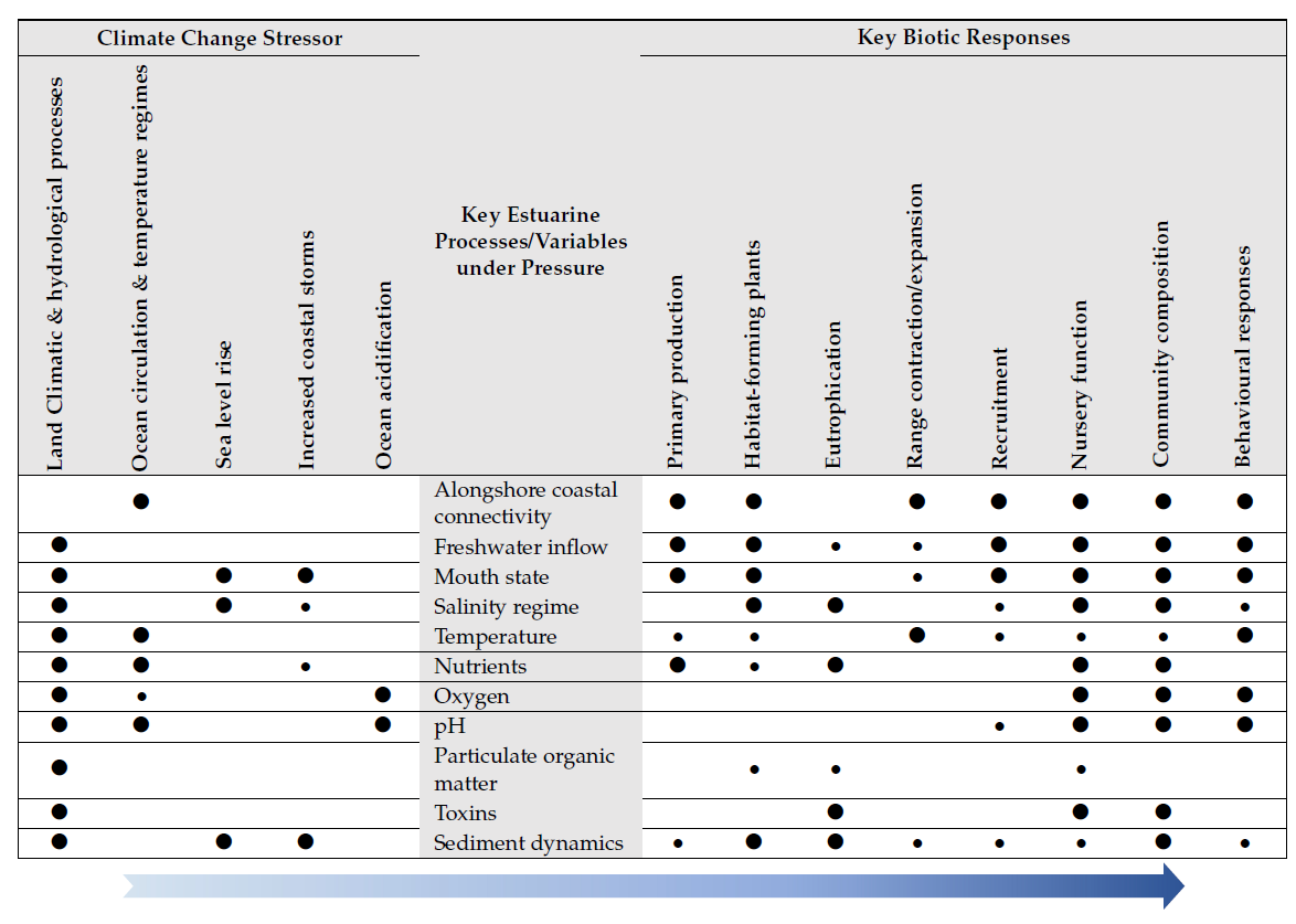 Climate change is a measurable reality and South Africa is especially susceptible to its impacts. The notable impacts associated with key climate change stressors on South African estuaries in order of importance, comprise: