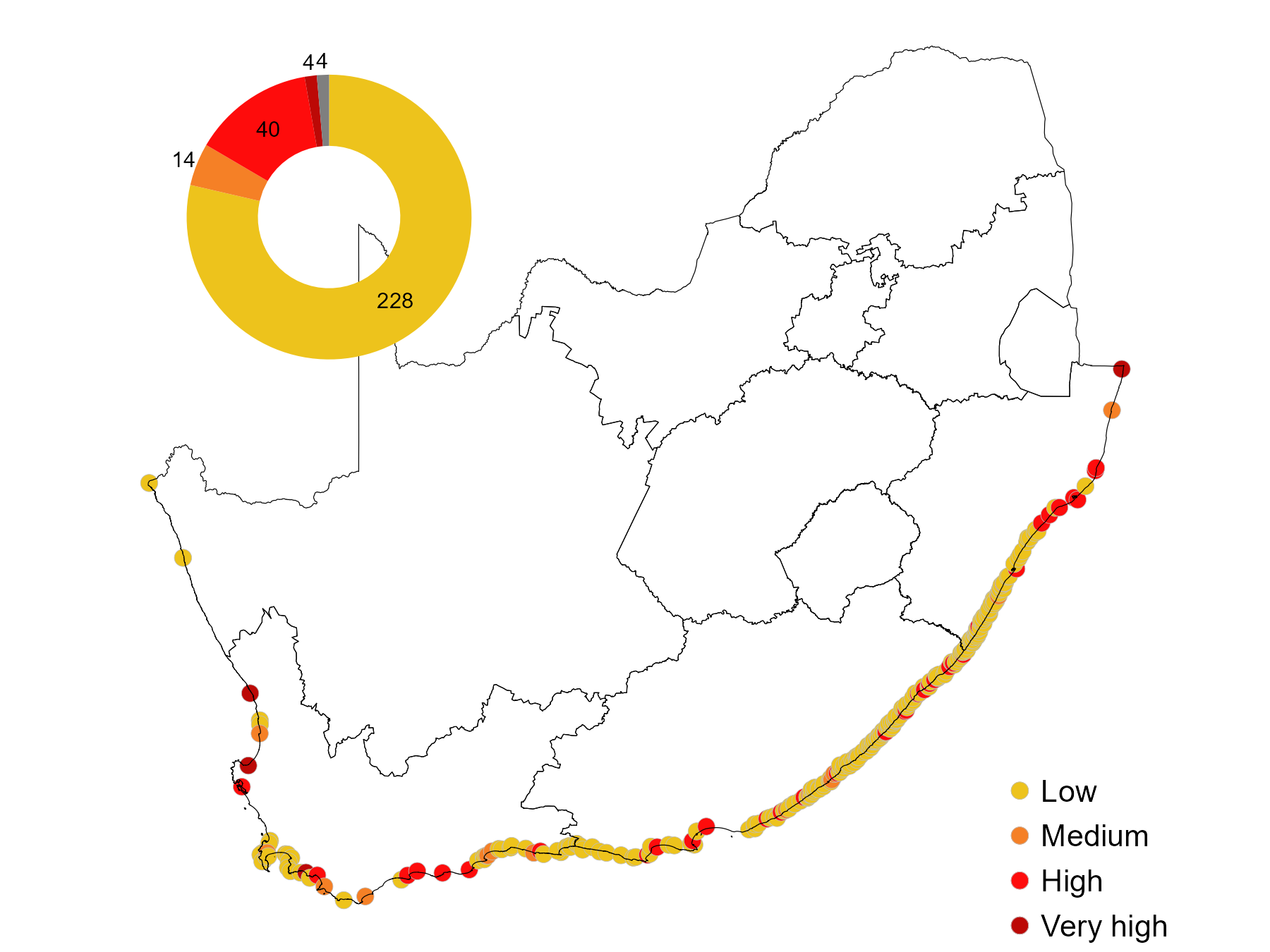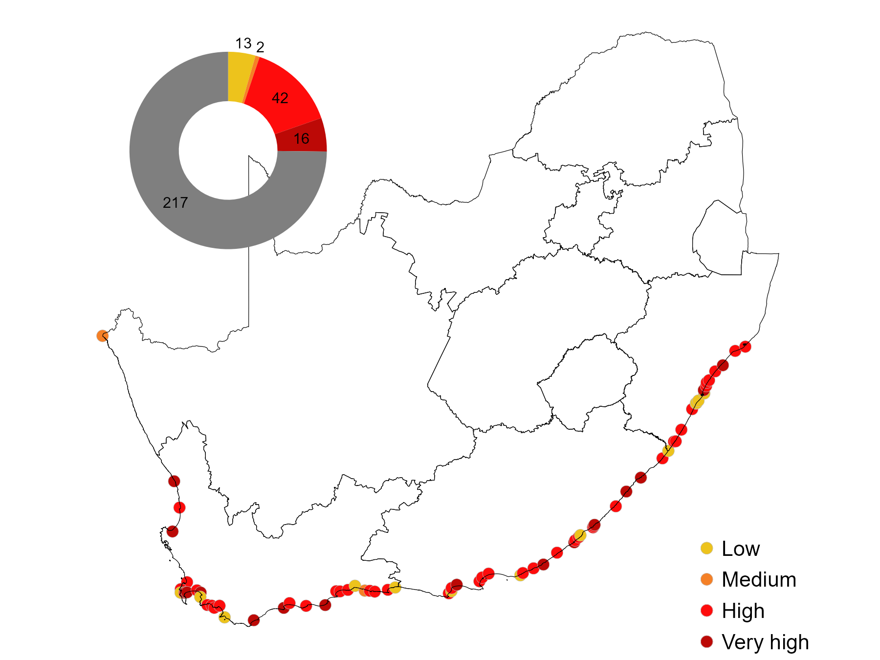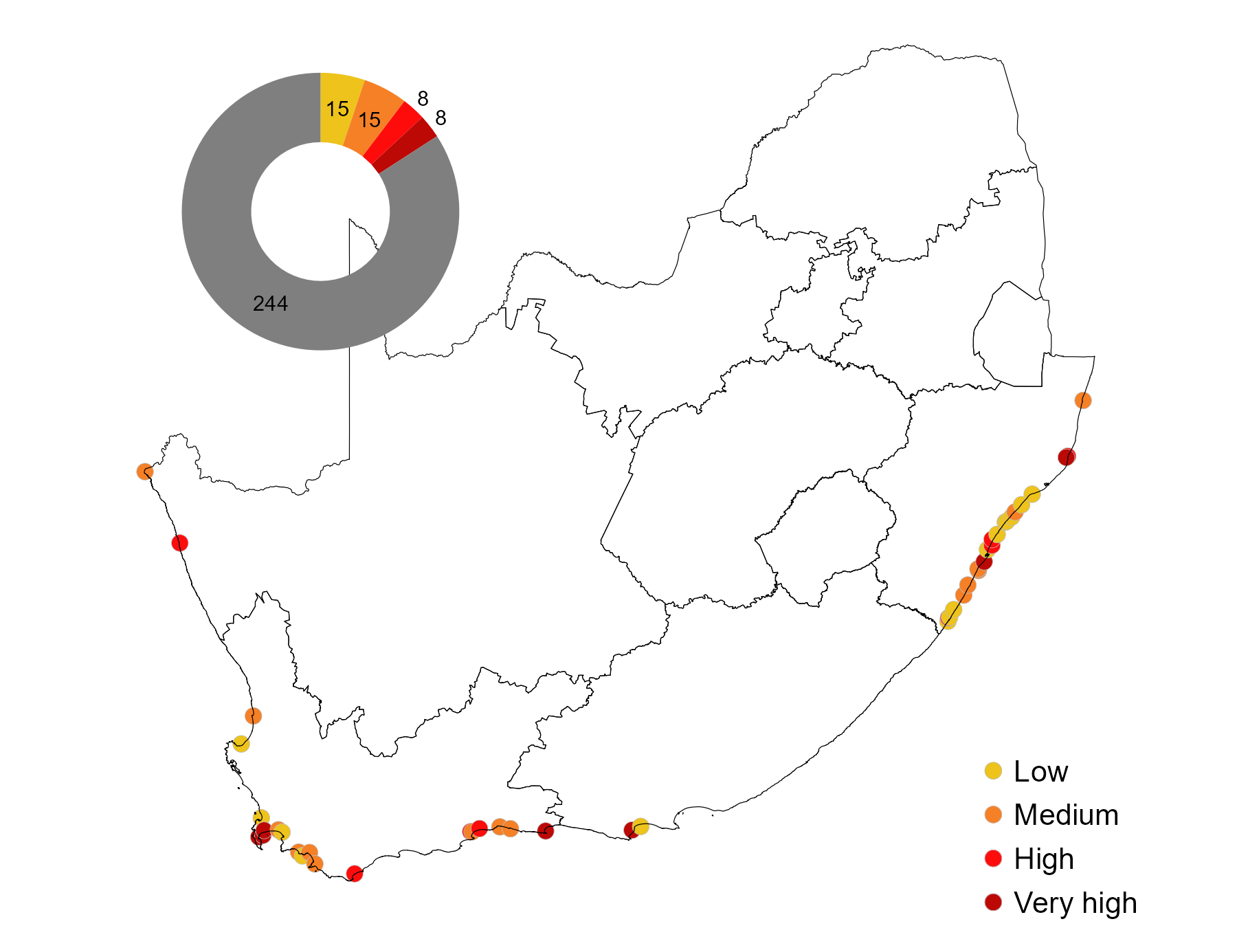 To evaluate pressure from alien or extralimital (translocated) fish species-level information was used from2. In addition, unpublished freshwater fish species data and field observations were considered (2). A species list per estuary was compiled and fish grouped into to (1) egg and larvae eaters (bluegill sunfish Lepomis macrochirus, mosquito fish Gambusia affinis, guppy Poecilia reticulata), (2) habitat altering species (carp Cyprinus carpio, grass carp Ctenopharyngodon idella) and (3) predatory species (smallmouth bass Micropterus dolomieu, spotted bass Micropterus punctulatus, largemouth bass Micropterus salmoides and sharptooth catfish Clarias gariepinus). Pressure rating for alien or extralimital fish were derived from the number and type of fish species present in individual estuaries, being Low = 1-2 species, Medium = 3-4 species, High = 5-6 species or 1-2 predatory species or sharptooth catfish Clarias gariepinus present (if translocated/ extralimital) or Very High = >7 species or 3- 4 predatory species.