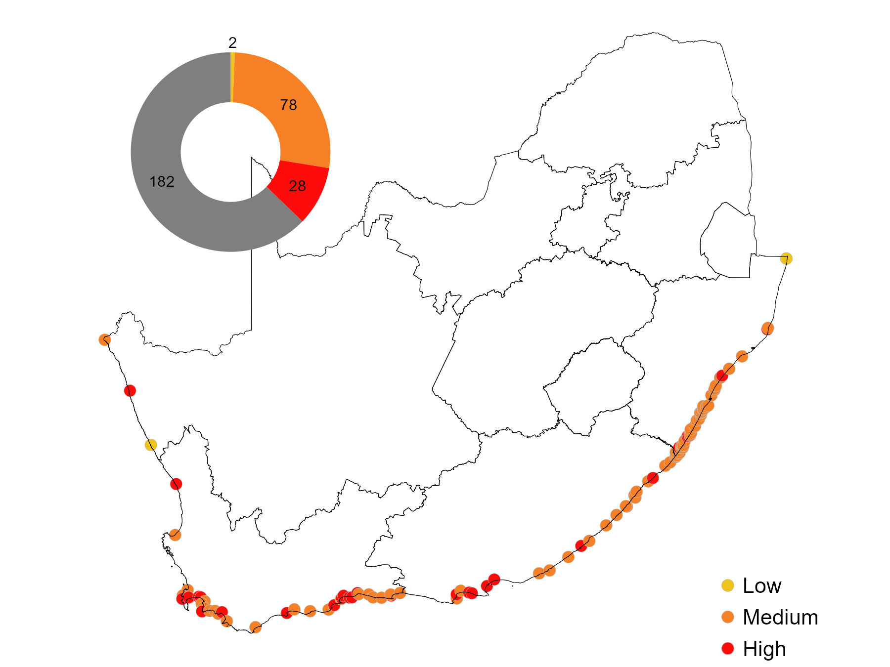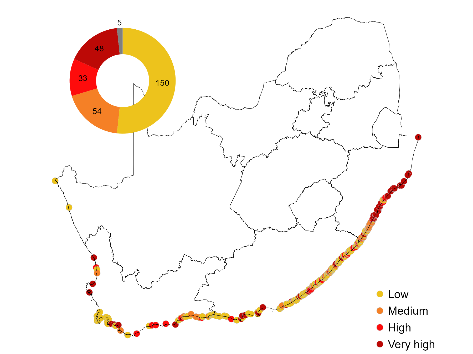 Overall, 30% estuaries are under high or very high cumulative pressure from flow reduction, pollution, overfishing, land-use change, biological invasions and artificial breaching. Multiple interventions are required to avoid further decline in health. These include protection of freshwater inflow to estuaries and the sea, restoration of water quality, reduction in fishing effort and avoidance of mining, infrastructure development and crops in the estuarine functional zone.