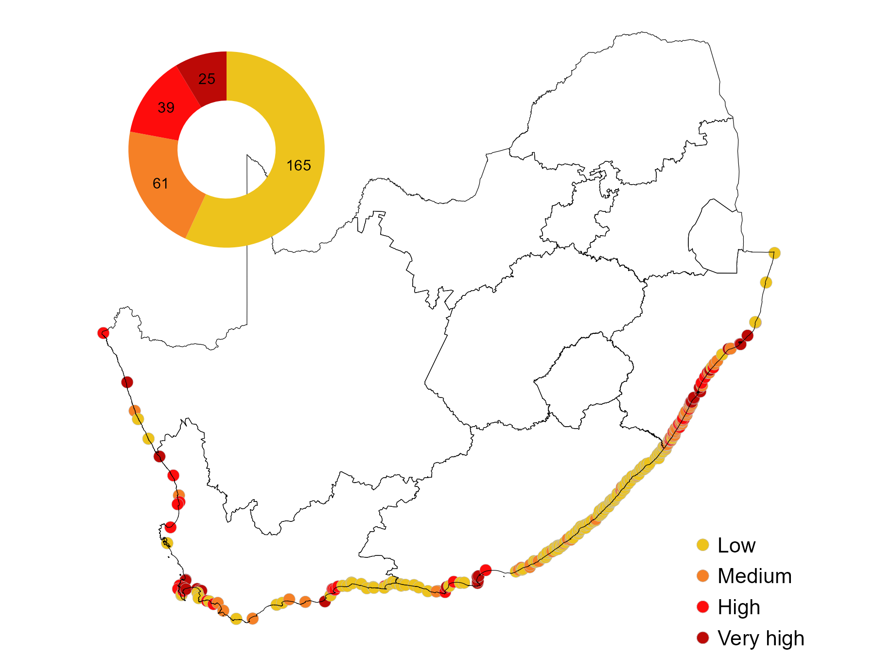 Approximately 15% of estuaries are artificially manipulated, but disproportionally represent more than 60% of extent. While it occurs in all biogeographic regions, it is most often associated with urban centres of Cape Town, Mossel Bay, Gqeberha, and Durban. Estuarine Lakes are most at risk from mouth manipulation, with most under pressure, followed by Large Fluvially Dominated, and Large Temporarily Closed types.