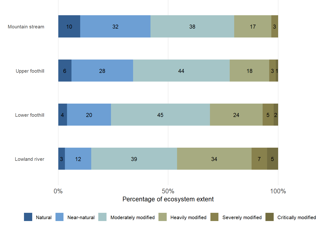 Only a quarter of the total length of river ecosystems in South Africa are in a natural/near-natural ecological condition, with three-quarters in a moderately modified or worse condition. Approximately 42% of mountain streams extent is in a natural or near-natural condition, in contrast with lowland rivers which have only 15% in a natural or near-natural condition. The extent of ecosystem modifications in lowland rivers reflects the geographic differences wide array of pressures that are concentrated in rivers that negatively impact on ecosystems and species.
