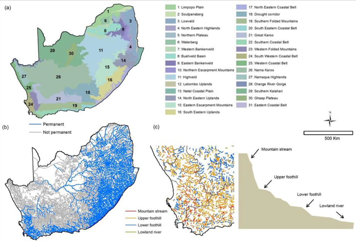 South Africa’s river types have been aligned with the Global Ecosystem Typology to support reporting into global processes, including the following Ecosystem Functional Groups, F1.1 Permanent upland streams, F1.2 Permanent lowland rivers, F1.4 Seasonal upland streams, F1.5 Seasonal lowland rivers, and F1.6 Episodic arid rivers.