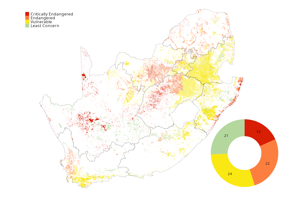 According to inland wetland ecosystem type, 72% of wetland types are Threatened, with 15 (18%) of inland wetland ecosystem types Critically Endangered, 20 (24%) Endangered, and 25 (30%) Vulnerable. The remaining 22 (27%) wetland types are Least Concern. Threatened wetland ecosystem types are spread widely across South Africa, while Critically Endangered and Endangered wetlands are clustered within the wheat belt / “mielie belt” agricultural lands of the central Free State extending into NorthWest Province, central Northern Cape, the Swartland agricultural lands of the Western Cape, the mining belt of Limpopo Province and the coastal regions of KwaZulu-Natal.