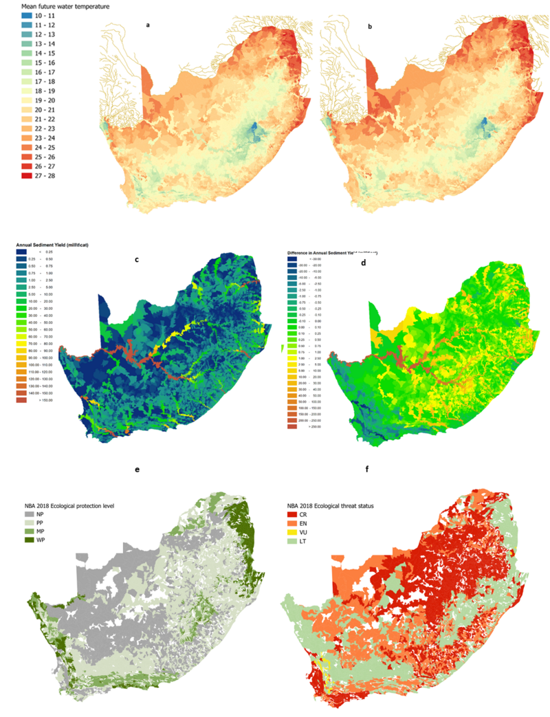 Impacts of climate change on water temperatures are projected to vary across South Africa by between 1 °C and 4 °C, with the highest increases in the semi-desert Kalahari. Areas of the already hot and dry Northern Cape are highlighted as being particularly imperilled by a situation of presently low protection level, high threat and climate-related pressures (Figure 1). The occurrence of certain types of land use within the surrounding catchment may raise water temperatures within rivers to around 0.1 °C higher than those driven by natural land cover. Notably, the Maputaland, coastal KwaZulu-Natal and Limpopo areas, where temperatures can rise by 0.2 - 0.3 °C, are highlighted as particularly vulnerable given the combination of low protection status, high ecosystem threat level, and some of the largest predicted shifts in temperature. Highs of 0.6 to 0.7+ above natural water temperatures may occur where large urban areas are located (Figure 1a, b)8. Temperature shifts have potentially highly impactful effects on species close to their thermal thresholds, highlighting an urgent need to define sentinel species for South African freshwaters9.