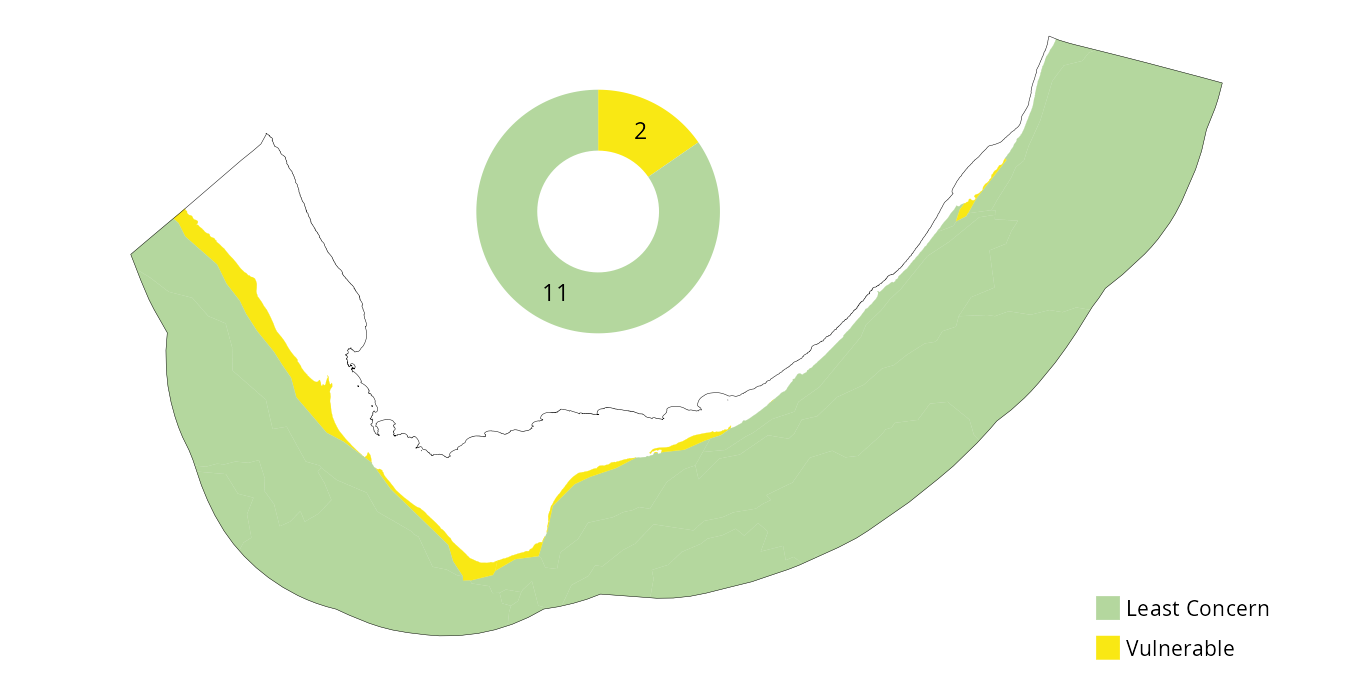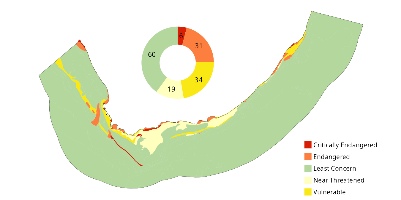 There are 31 Endangered ecosystem types (19%) which cover 0.9% extent of the marine realm area. Many of these are ecosystem types of limited extent that were uplisted (considered more threatened) relative to 2019 due to the application of global standards in 2025. For example, False and Walker Bay, St Helena Bay and Eastern Agulhas Bays (Algoa and St Francis) are all Endangered under either criterion B1 or B2 of the IUCN RLE.