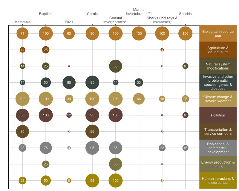 A total of 495 marine species have been assessed using the IUCN Red List of Threatened Species criteria and are included in the NBA, drawing from a combination of national, regional and global assessments. Of these, approximately 36% of taxa are threatened in 2025, while 18% of 376 assessed species were threatened in 2018. This difference is due to the inclusion of additional species (including all sharks, rays and chimaeras, additional corals and selected marine invertebrates), many of which are threatened. However, the high proportion of threatened taxa is not fully representative of the extinction risks at the realm level because there has been a focus on assessing economically important species and groups known to be at risk (such as corals, sharks, rays and chimaeras, rock lobsters and abalone). The lack of comprehensively assessed marine taxonomic groups leads to an inflated bias of threat results.
