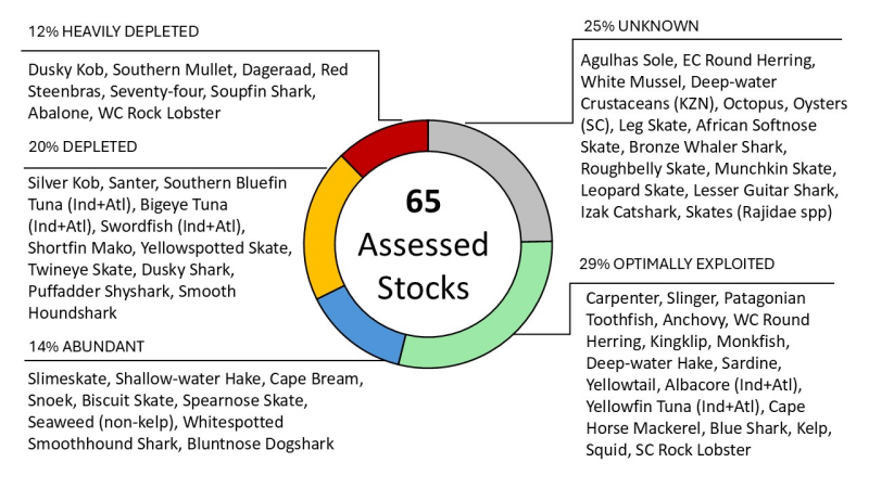 Information about resource stock status is drawn from the Department of Forestry, Fisheries and the Environment’s State of Fishery Resources reports23 to provide an overview of species stock status for fished taxa and examine main trends in marine resources over the assessment period.