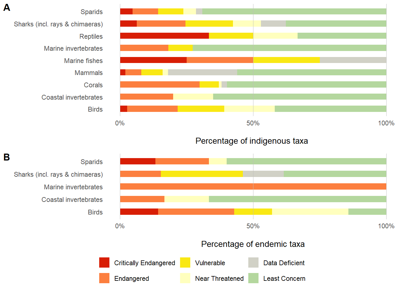 South Africa’s IUCN Red List assessment work is coordinated by SANBI’s Threatened Species Programme but is conducted by groups of species specialists. A total of 495 South African marine species have been assessed using the IUCN Red List criteria through a combination of national, regional and global assessments. Assessments of sharks, rays and chimaeras, sparids, and corals were undertaken by the IUCN species specialist groups, with many species assessed using global assessments. However, 33 species of cartilaginous fishes (sharks, rays and chimaeras) were assessed nationally, meaning that the IUCN criteria were applied to the portions of the populations that occur in South Africa’s water. Adjustments were undertaken for species where we had sufficient data to show that extinction risk trends were different from global trends.