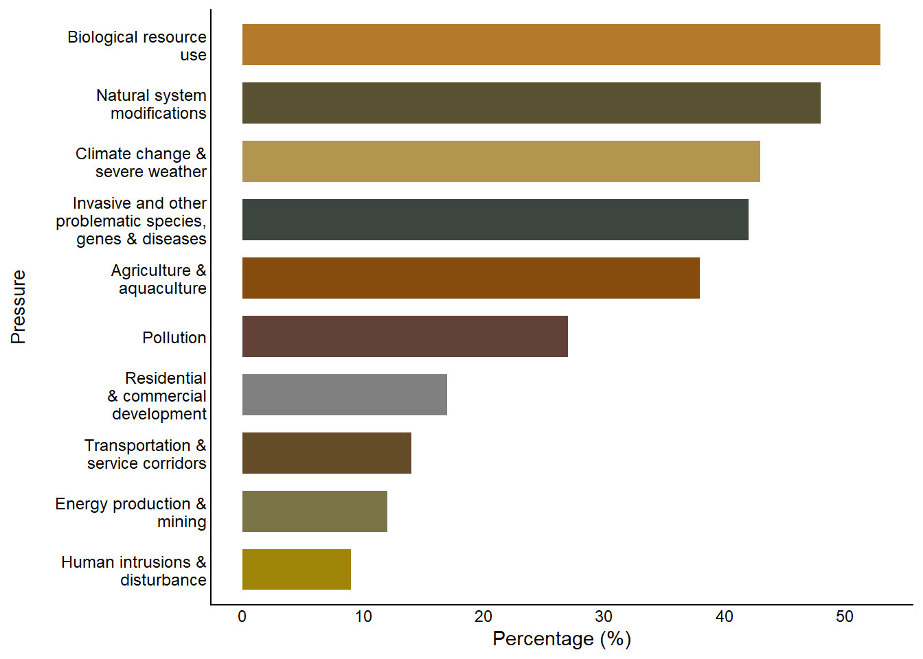 Climate change emerges as the third major pressure at 30%, driven predominantly by habitat shifting and alteration as species distributions respond to changing climatic conditions.