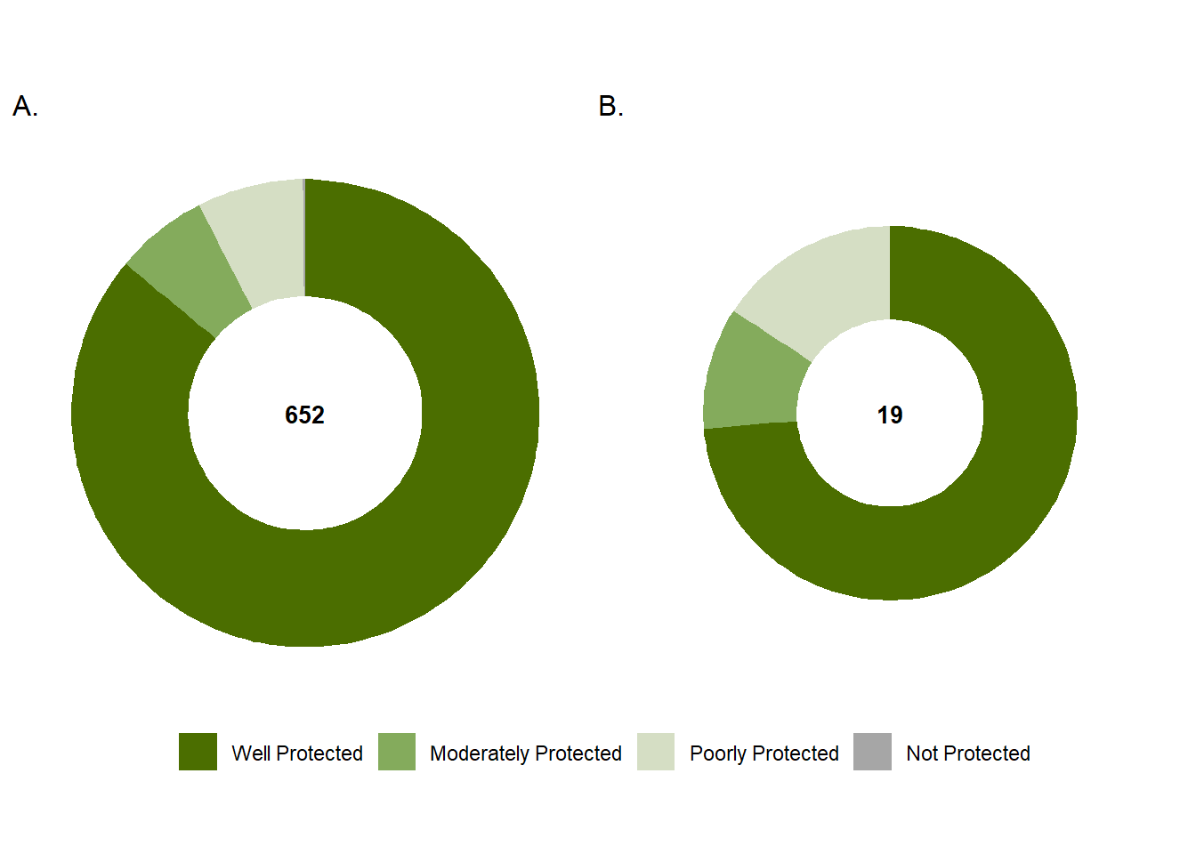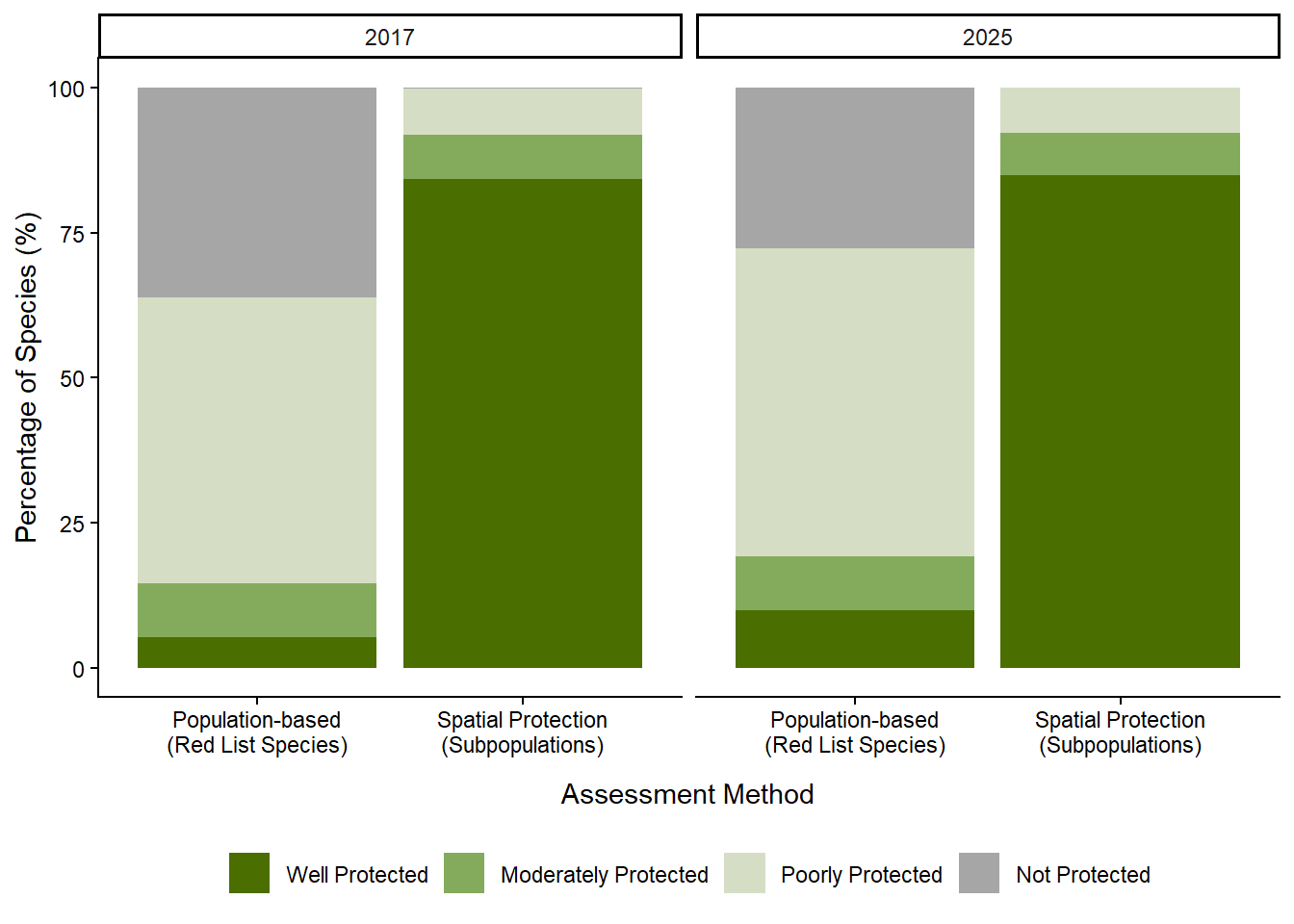 When protection level is assessed using a Minimum Conservation Population (MCP) approach that incorporates species-specific abundance thresholds, protection levels are far lower: only 10% of Red Listed species are Well Protected, while the vast majority (90%) remain inadequately protected despite occurring within the protected area network.
