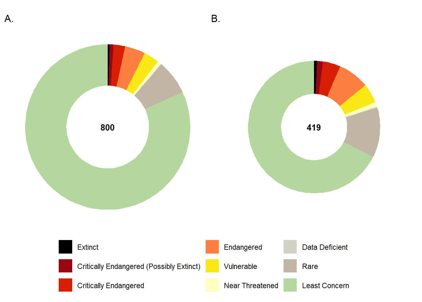 | Taxon | Extinct | Critically Endangered (Possibly Extinct) | Critically Endangered | Endangered | Vulnerable | Near Threatened | Data Deficient | Rare | Least Concern | Total |