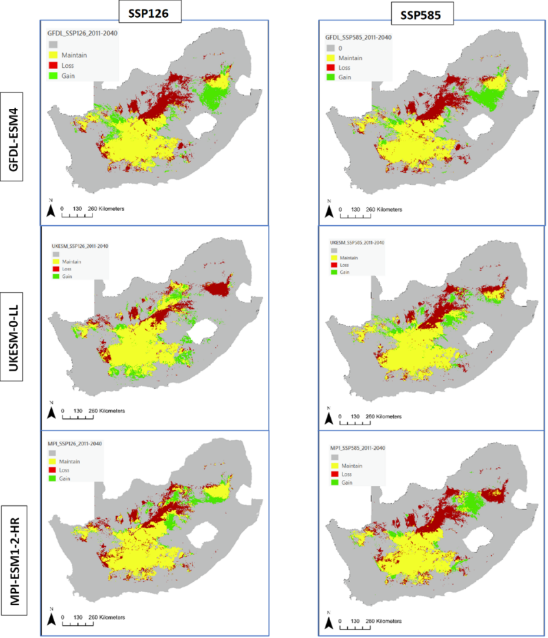 | 1 Note: SSP126 = sustainable development scenario (2°C warming limit); SSP585 = business-as-usual scenario (>4°C warming). Negative values indicate habitat loss; positive values indicate habitat gain. Averages calculated across three climate models (GFDL-ESM4, UKESM1-0-LL, MPI-ESM1-2-HR). Most species were modeled for 2011-2040, except Bontebok and Cape Mountain Zebra which were modeled for 2041-2070 based on their generation times. | |||
