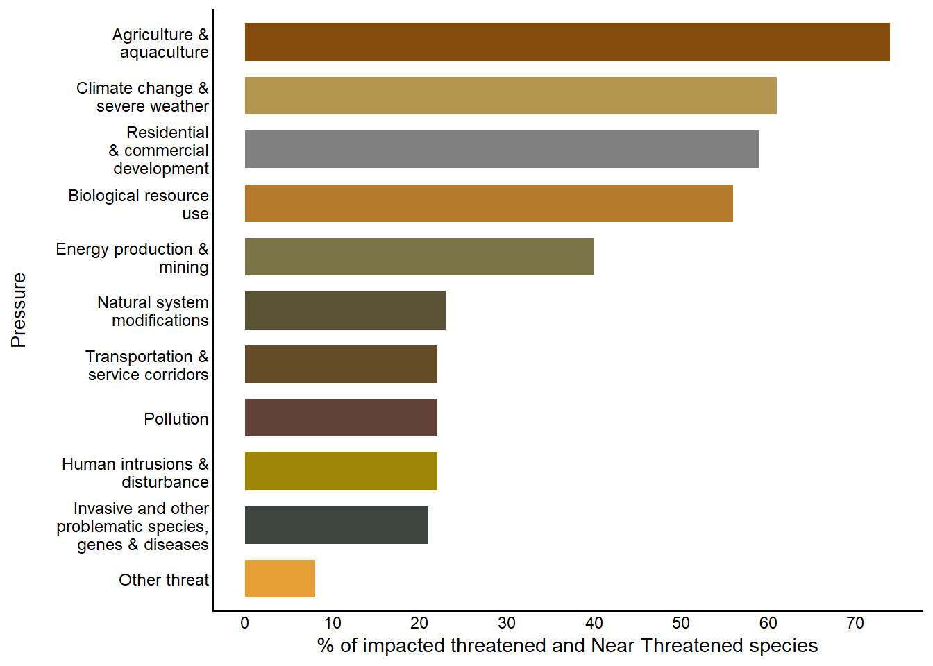 The main pressures driving change in threat status are habitat loss and degradation due to agricultural and urban expansion, climate change and extreme weather conditions, as well as over-exploitation and poaching.