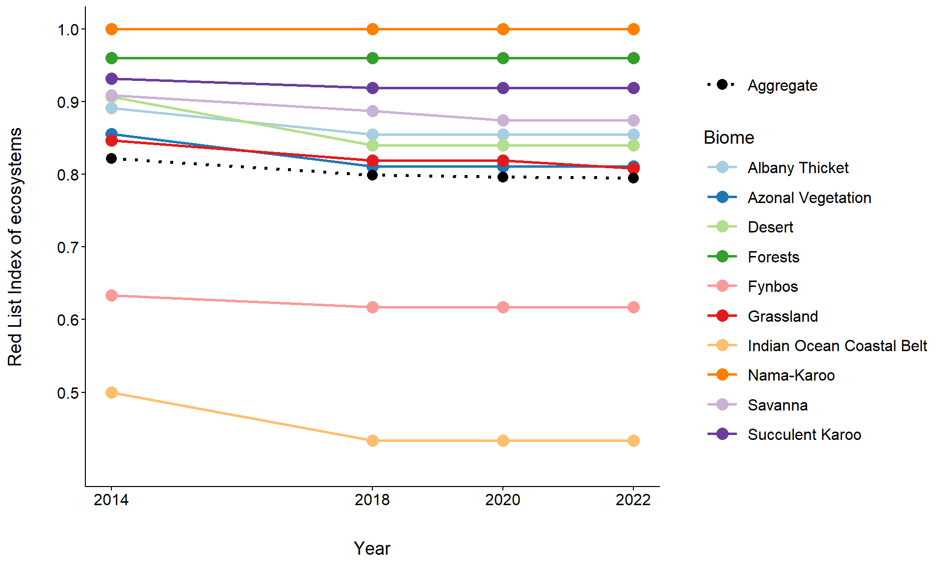 The Indian Ocean Coastal Belt has experienced the steepest decline and has the lowest overall RLIe, falling from 0.50 in 2014 to 0.43 in 2024. All ecosystem types in this biome are threatened and over time they are moving into higher risk categories. This steep downward trend reflects growing pressures from land-use conversion, including the expansion of croplands, urban development, and plantations. The Fynbos Biome, renowned for its exceptional biodiversity, faced substantial historical pressures resulting in low RLIe scores (0.62) but these are reasonably stable since 2018 suggesting that the main drivers of change, particularly agricultural pressure in lowland areas, have been entrenched for many years. In the Desert, Albany Thicket and Grassland biomes there are fewer threatened ecosystems and hence slightly higher RLIe (~0.8) but these scores have dropped substantially since 2014, suggesting accelerating pressures.