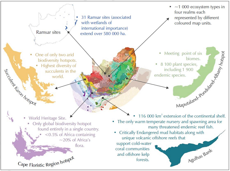 South Africa has exceptional biodiversity that is globally recognised, characterised by high species richness, high rates of endemism and a wide variety of ecosystem types. Although among the smaller of the world’s 17 megadiverse countries, which together contain more than two-thirds of the world’s biodiversity, South Africa ranks in the global top ten of countries in terms of plant species richness and third for marine species endemism. The country holds three of the world’s 36 recognised biodiversity hotspots, 31 Ramsar sites (wetlands of international importance, including the subantarctic Prince Edward Islands) and the Agulhas Bank that is an equivalently unique marine ecosystem (Figure 1). Applying the international standard, South Africa has identified 263 terrestrial Key Biodiversity Areas (KBAs), which are sites of global biodiversity significance. This network of KBAs is expected to expand over time as the marine realm is assessed.