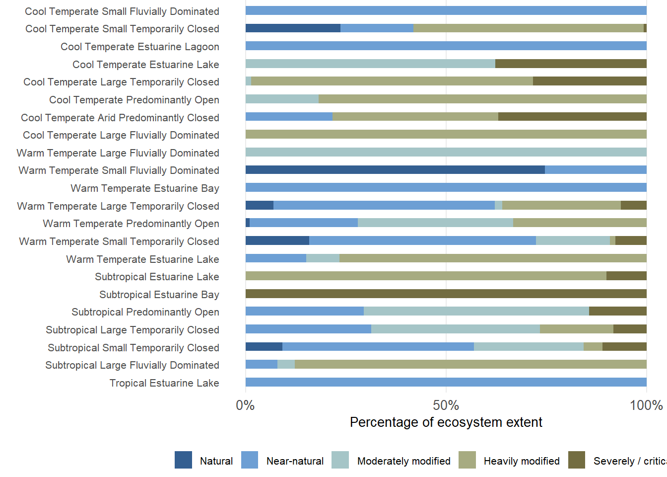 From an Estuarine Ecosystem perspective, the Cool Temperate biogeographical region had the highest percentage of ecosystem types in a Heavily to Severely/critically modified state with Large fluvially dominated, Large temporarily Closed, Arid predominantly closed, Small temporarily closed and Estuarine Lakes reflecting key pressures such as flow reduction, pollution and fishing pressure of the region.