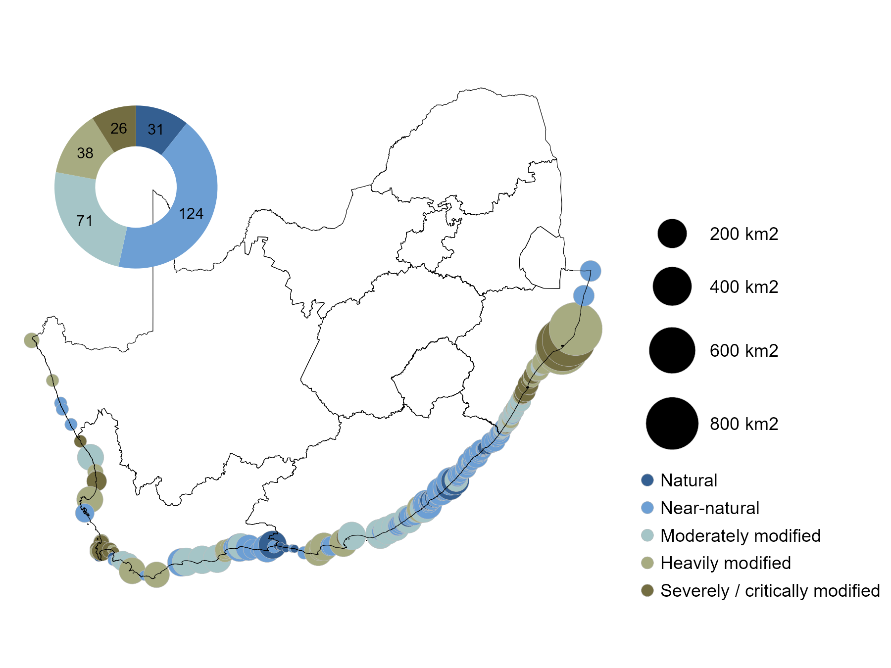 More than 53% of South Africa’s estuaries are relatively healthy, but this amounts to only 18% of total estuarine extent, comprised mostly of small estuaries. Concerning the overall, more than 70% of estuarine area is significantly modified.