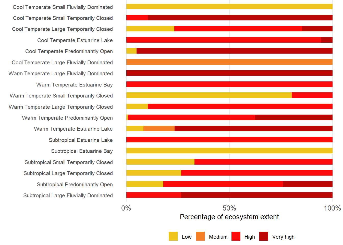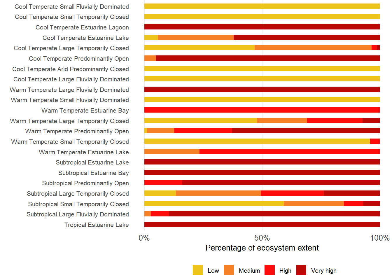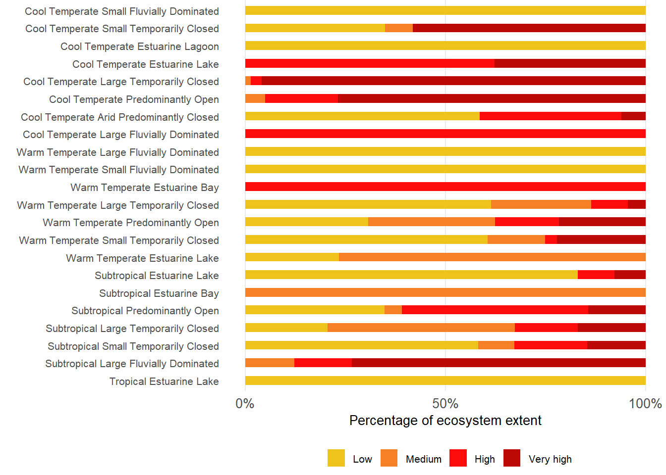 About 35% of estuarine extent are under severe pressure from alien or extralimital fish invasion, mostly in Temperate regions. About 76% and 65% of Warm and Cool Temperate regions respectively, are subjected to severe levels. Less than 60% of area remains unaffected by alien or extralimital fish invasion, mostly in the Tropical region. Severe pressures are most prevalent in Predominantly Open, Estuarine Bays, Large Temporarily Closed; Large Fluvially Dominated, Large Temporarily Closed and Estuarine Lake types.
