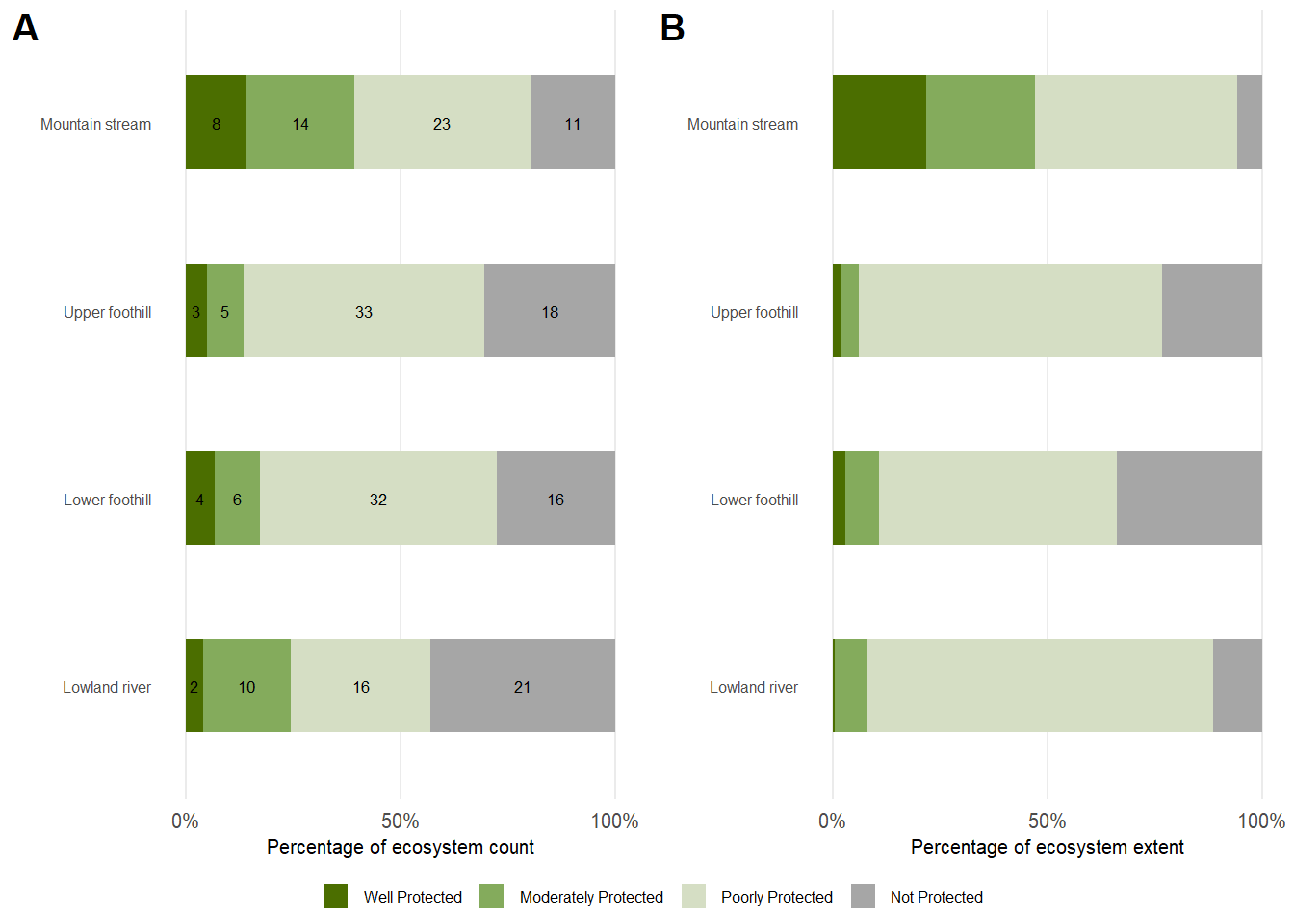 In terms of river geomorphological zone, only 16% of the river ecosystem types within the lower foothill and mountain stream zones are Well Protected. More than half of lowland river ecosystem types are Not Protected (61%), reflecting the bias of the protected area network towards mountain versus lowland areas.