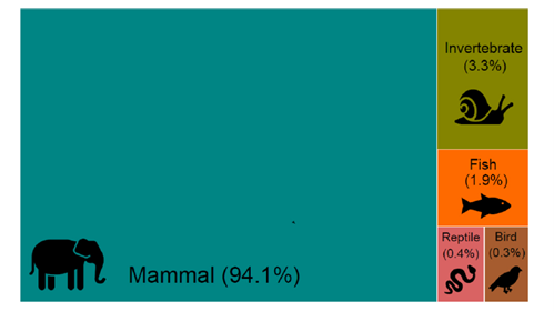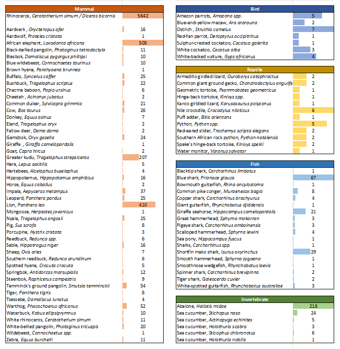Mammals accounted for the vast majority of cases, reflecting the high incidence of poaching and illegal trade involving species such as black and white rhinoceros, African elephant (Loxodonta africana), lion (Panthera leo), and greater kudu (Tragelaphus strepsiceros).