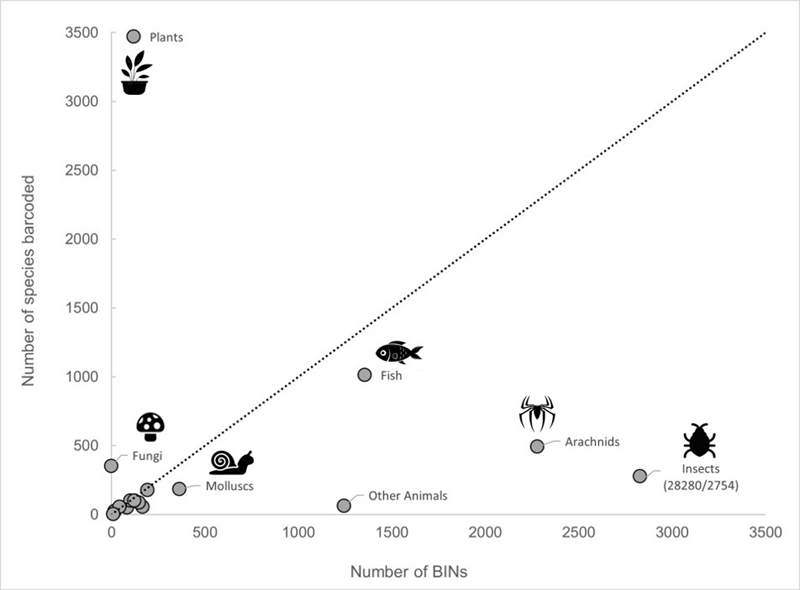 Since 2016, contributions to the reference library have grown substantially, with numerous South African researchers and institutions submitting data on indigenous species. As of 28 October 2025, BOLD contains 786 480 sequences (multiple gene sequences for some records), representing 776 512 specimens from South African localities. Approximately, 93% (725 590) of these records are assigned to 59 606 Barcode Index Numbers (BINs), which represent OTUs. However, only 94 010 specimen records have been identified to species level, representing 16 425 species (Figure 2). This highlights ongoing needs for taxonomic capacity and expertise.