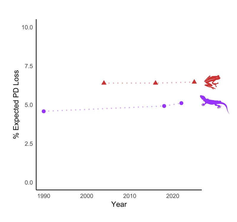 In a recent case study2, this approach was applied to South Africa’s amphibians and reptiles, both of which have exceptionally high levels of endemism (around 50%). By integrating extinction risk data with measures of phylogenetic diversity (PD), researchers found that, without conservation action, about 6.5% of amphibian PD and 5% of reptile PD could be lost over the next 50 years (Figure 3).