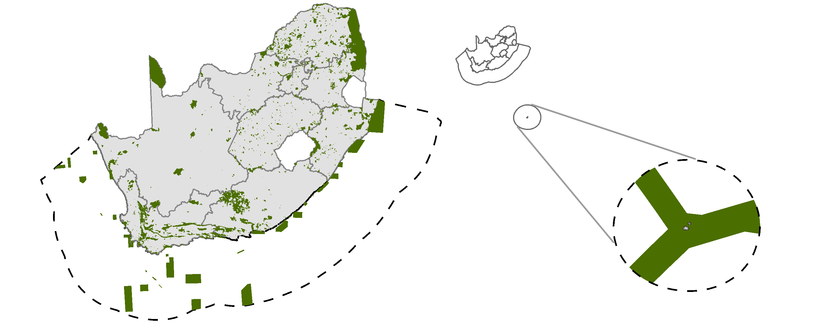 EPL is calculated using protected areas, recognised under the National Environmental Management: Protected Areas Act (Act 57 of 2003)2. The Act provides for several categories of protected areas, including Special Nature Reserves, National Parks, Nature Reserves, Marine Protected Areas, and Protected Environments. In addition, it also recognises World Heritage Core Sites, especially Protected Forest Areas, and Mountain Catchment Areas. The EPL indicator does include a narrow range of legally secure Other Effective Conservation Measures (OECMs) as contributing to meeting protection targets (Figure 1) and, as additional OECMs are evaluated and mapped across the country they will be considered in the computation of the indicator.