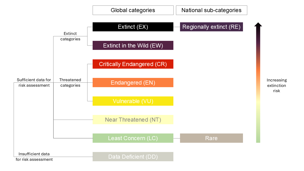 South Africa uses the IUCN Red List of Threatened Species Categories and Criteria to assess species’ risk of extinction. This system is the international standard for reporting on the status of biodiversity in multilateral environmental agreements such as Target 4 of the Convention on Biological Diversity’s Kunming-Montreal Global Biodiversity Framework.