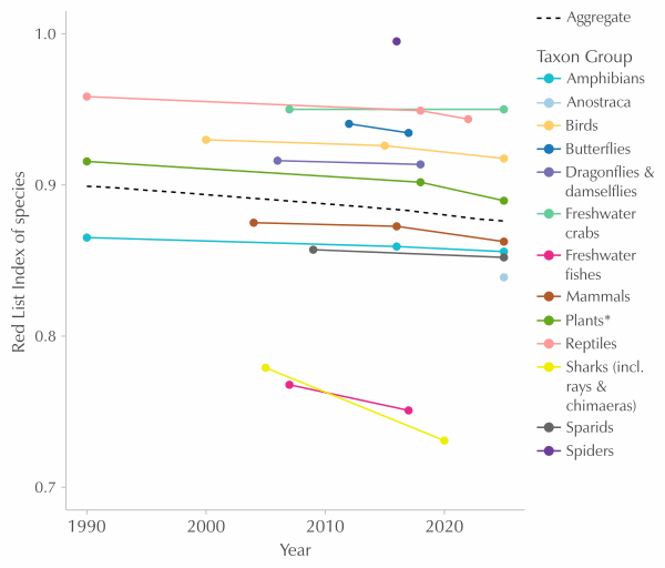 The trend in species status over time was measured using the globally recognised indicator, the IUCN Red List Index of species (RLI). The RLI is calculated for specific taxonomic groups based on genuine changes in Red List categories over time. The RLI value ranges from 0 to 1 where lower values indicate that more species within the taxonomic group are at a high risk of extinction, the slope of the plot shows the rate of decline towards extinction. If the value is 1, all taxa are Least Concern and if the value is 0, all taxa are Extinct. The RLI is calculated only for comprehensively assessed taxonomic groups or groups where a representative sample has been selected. Changes in status over time have been tracked for 13 taxonomic groups (Figure 1).