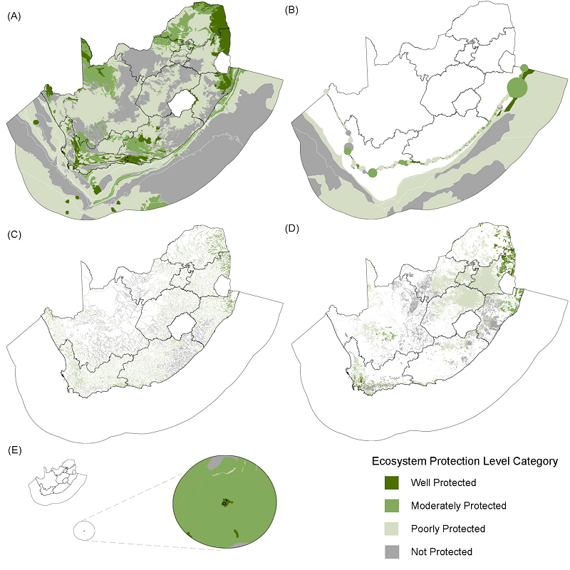 The spatial patterns of protection level reflect the geography of the protected area network: terrestrial ecosystem types around large national parks (e.g., Kruger National Park in the northeast of the country) are Well Protected (Figure 4 A). Under-protected regions on the mainland include the grasslands of the Free State and interior of the Eastern Cape, and the Nama Karoo. Other gaps in the protected area network are evident in the offshore eastern portion of the marine realm, the southern Eastern Cape coast and the Northern Cape coast (Figure 4 A, B). Most coastal ecosystem types are represented in protected areas, although only a quarter of the extent is Well or Moderately Protected. The Prince Edward Islands Marine Protected Area in South Africa’s subantarctic territory provides protection to most ecosystem types, with almost half the types being Well Protected, however, these comprise a small portion of the territory (Figure 4 E).
