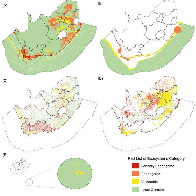 Generally, ecosystem types with a limited distribution tend to be more highly threatened than extensive types – this is evident when Figure 1 A and B are compared. In the marine realm, the larger remote offshore ecosystem types are generally less threatened than the smaller inshore ecosystem types; in the terrestrial realm the large ecosystem types of the Nama-Karoo are less threatened than the many small types in the Fynbos Biome (Figure 2 A). The Eastern Cape estuaries (specifically along the Wild Coast) are less threatened than those on the Cape West Coast and southern KwaZulu-Natal (Figure 2 B), reflecting the condition of their catchments and lower coastal development. The rivers of northern KwaZulu-Natal, Lowveld and Succulent Karoo are generally less threatened than other regions of the country (Figure 2 C). Wetlands of the interior Highveld, along the Escarpment and the southwestern Cape are the most threatened (Figure 2 D). In the marine realm, the Southern Benguela ecoregion has more threatened ecosystems than the Agulhas ecoregion, and most of the threatened ecosystem types in the Natal–Delagoa ecoregion are concentrated in the KwaZulu-Natal Bight (Figure 2 A).