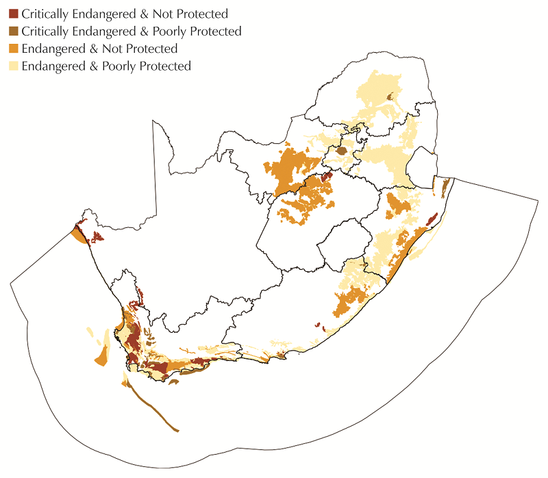 A quarter of terrestrial ecosystem types (115/463) are highly threatened and under-protected. The Fynbos Biome and Namaqualand contain many Critically Endangered and under-protected ecosystem types while the grasslands of the interior and the Indian Ocean Coastal Belt have many Endangered and under-protected types.