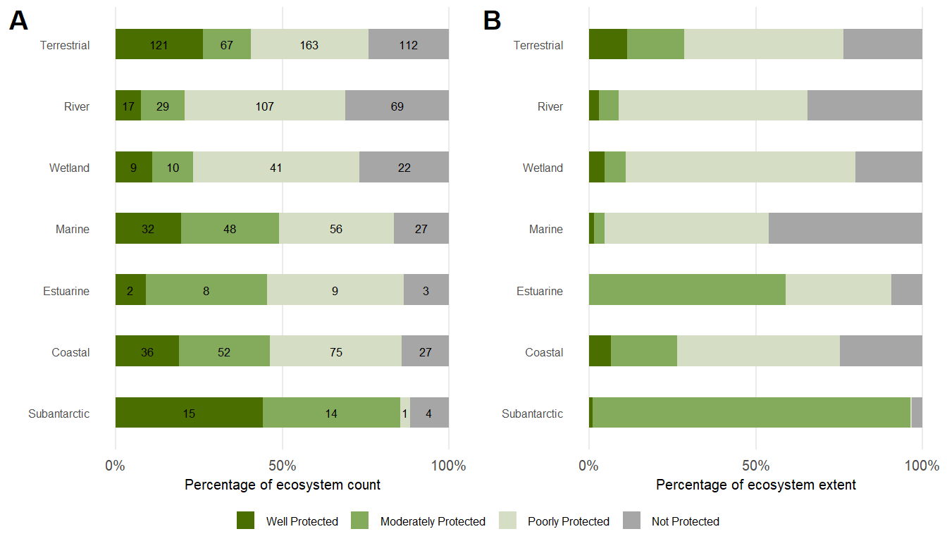 Over a third of river ecosystem types (82/222) and a third of wetland types (29/82) are highly threatened and under-protected. Lowland river ecosystem types and depression wetlands have the highest proportion of types in this combined threat and protection category.