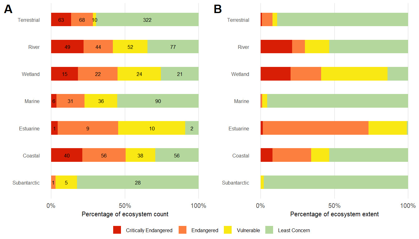 Wetland, river and estuarine ecosystems are threatened, with over half of the ecosystem types and ecosystem extent of rivers and wetlands listed as Critically Endangered, Endangered or Vulnerable; while for estuaries these figures are over 75% (Figure 1). This reflects the poor ecological condition of wetland, river and estuarine ecosystems that are overwhelmed by a variety of compounding pressures, particularly, increasing disruptions to the hydrological regime and deteriorating water quality, with fishing being an additional pressure in estuaries. Similarly high levels of pressure are evident on the coast, with 71% of ecosystem types being threatened, comprising almost half of the coastal extent. In contrast, a relatively large proportion of marine and terrestrial ecosystem types are listed as Least Concern. This is in part due to the relatively low pressure on some ecosystem types (e.g., abyssal or remote mountain ecosystem types) and due to inadequate data on pressures in utilised ecosystem types (e.g., marine pelagic fishing and grazing pressures in rangelands). Ecosystem assessments are updated periodically, and new information and methods of measuring risk of ecosystem collapse will inform future assessments.