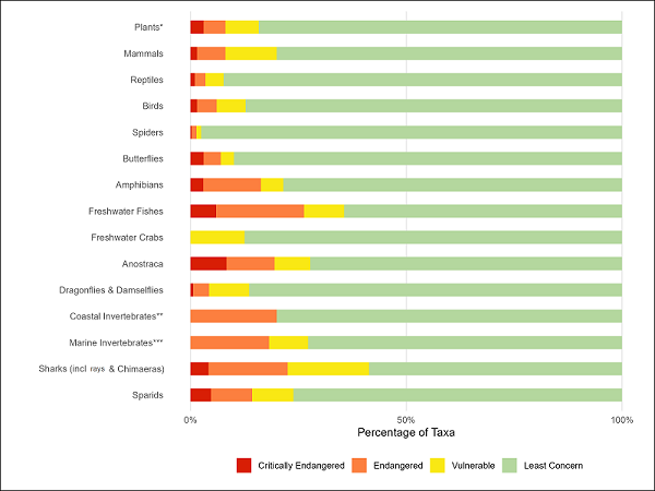 Species threat status: Of 20 248 plant species assessed, 16% are threatened. Of 5 226 animal species assessed, 10% are threatened. The most threatened taxonomic groups are freshwater fishes and cartilaginous fishes (sharks, rays and chimaeras).