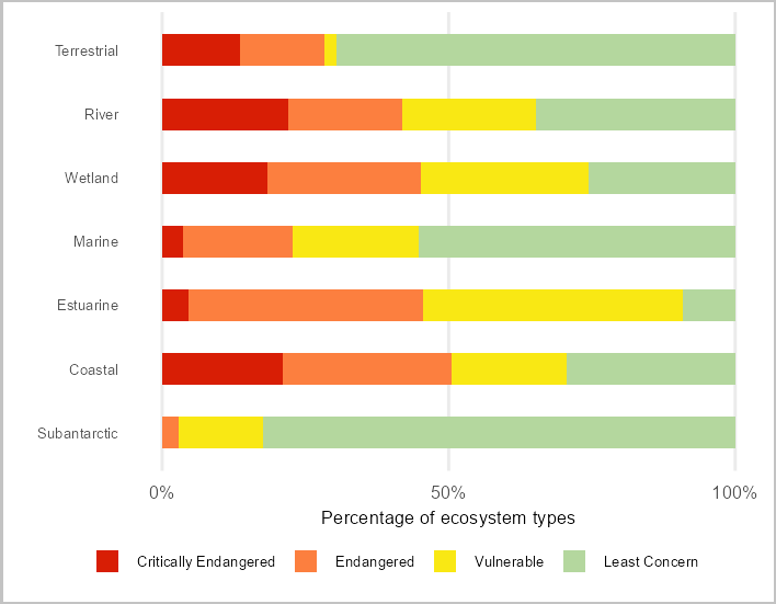 Ecosystem threat status: Almost half of the 986 ecosystem types assessed in the NBA 2025 are threatened. Estuaries, wetlands, rivers and the coast have the highest proportion of threatened ecosystem types.