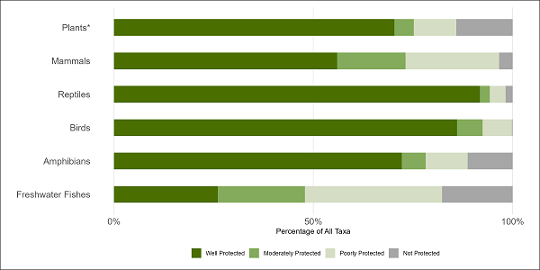 Species protection level: Almost 70% of plant species are Well Protected (based on a random sample of 900 taxa). All mammal, reptile, bird, amphibian and freshwater fish species were assessed and overall 77% are Well Protected.