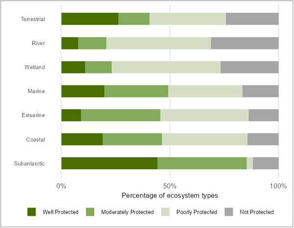 Ecosystem protection level: Over three-quarters of ecosystem types are represented in the current protected area network, leaving 24% in the Not Protected category. River, wetland and estuary types have the lowest levels of protection.