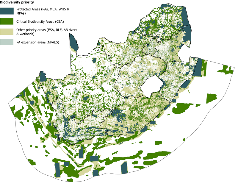 Biodiversity inclusive spatial planning (key messages A1, A2, A3, B1, B2, B3, B4): Biodiversity and ecological infrastructure are powerful socio-economic engines contributing to South Africa’s development. The negative impacts on biodiversity, both direct (e.g., land clearing, built infrastructure) and indirect (e.g., pollution, changes to natural processes), from land and sea use change can be avoided or minimised through effective biodiversity inclusive spatial planning. South Africa has well-established provincial spatial biodiversity planning and prioritisation processes, plus screening tools for biodiversity sensitivity in development sites (Figure 1). Ongoing investment is needed to keep these plans and tools current with the latest biodiversity data, and ensure they inform decision-making at national, provincial and local levels. Marine Spatial Planning processes offer robust opportunities for biodiversity plans to influence use in the marine realm and along the coast. Biodiversity inclusive spatial plans can also guide ecosystem restoration and expansion of protected and conserved areas.