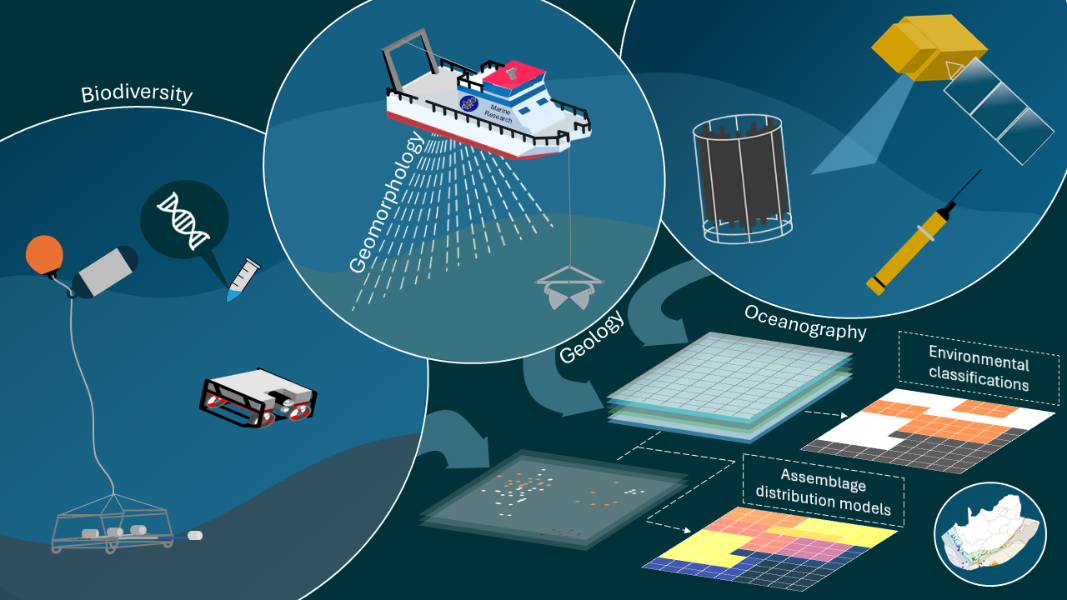 The updated environmental layers have been organised by topical project groups, which include oceanography, geology and geomorphology. A suite of oceanographic (physical, chemical and phytoplankton) variables for surface and seafloor depths were downloaded from the Bio-ORACLE platform and calculated from Copernicus Marine Service satellite products and regional ocean model hindcasts provided by SAEON and SOMISANA. Updated sediment data were sourced from collaborators, greatly increasing the inventory of marine sediment sample and seafloor description records. Interpolated maps of sediment characteristics were additionally sourced from dbSEABED. Geomorphological variables included a new, national-scale, 100-m resolution bathymetry map9, from which derived variables such as slope angle, bathymetric position index and rugosity were calculated.