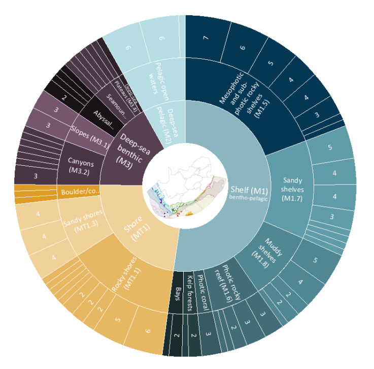 The 2023 Marine Ecosystem Map includes 128 shore and shelf ecosystem types which are considered benthopelagic, with 22 deepsea benthic and 13 deepsea pelagic ecosystem types (Figure 2). These 163 ecosystem types nest within 17 ecosystem functional groups (Figure 2) that align with those of the IUCN GET, except for minor differences in terminology, and South Africa included Bays as a distinct group. The ecosystem functional groups are nested within bathomes, which represent geomorphological depth categories equivalent to ‘biomes’ in the IUCN GET.
