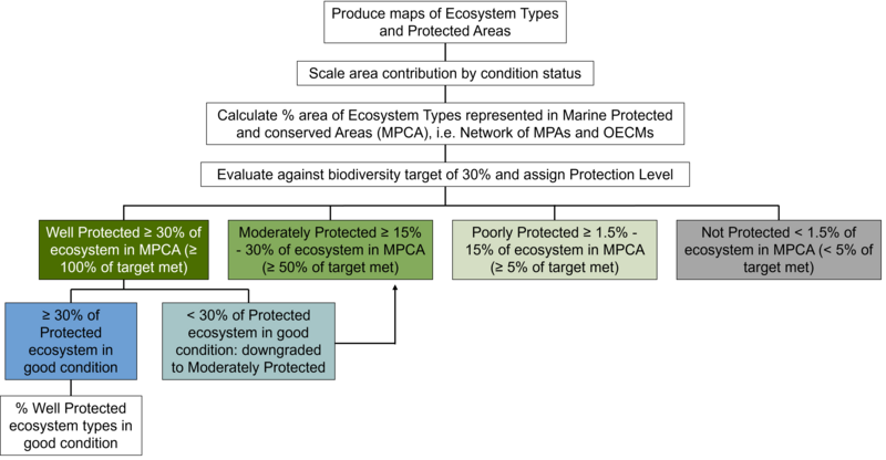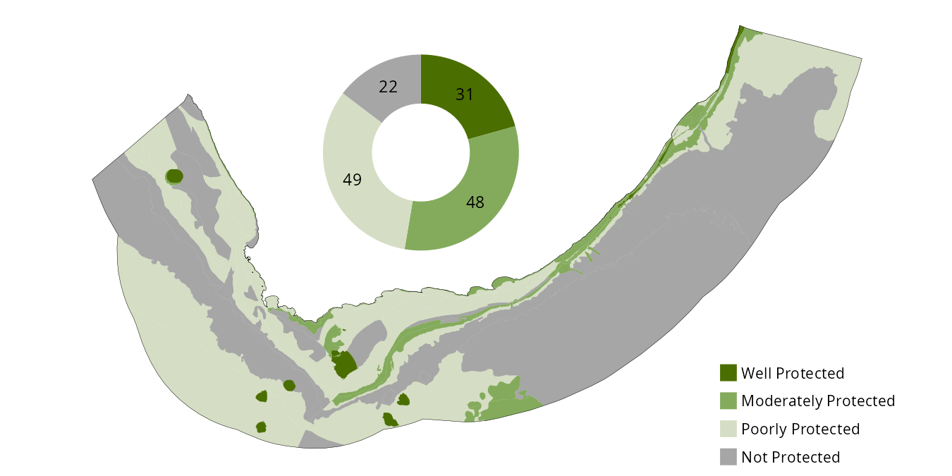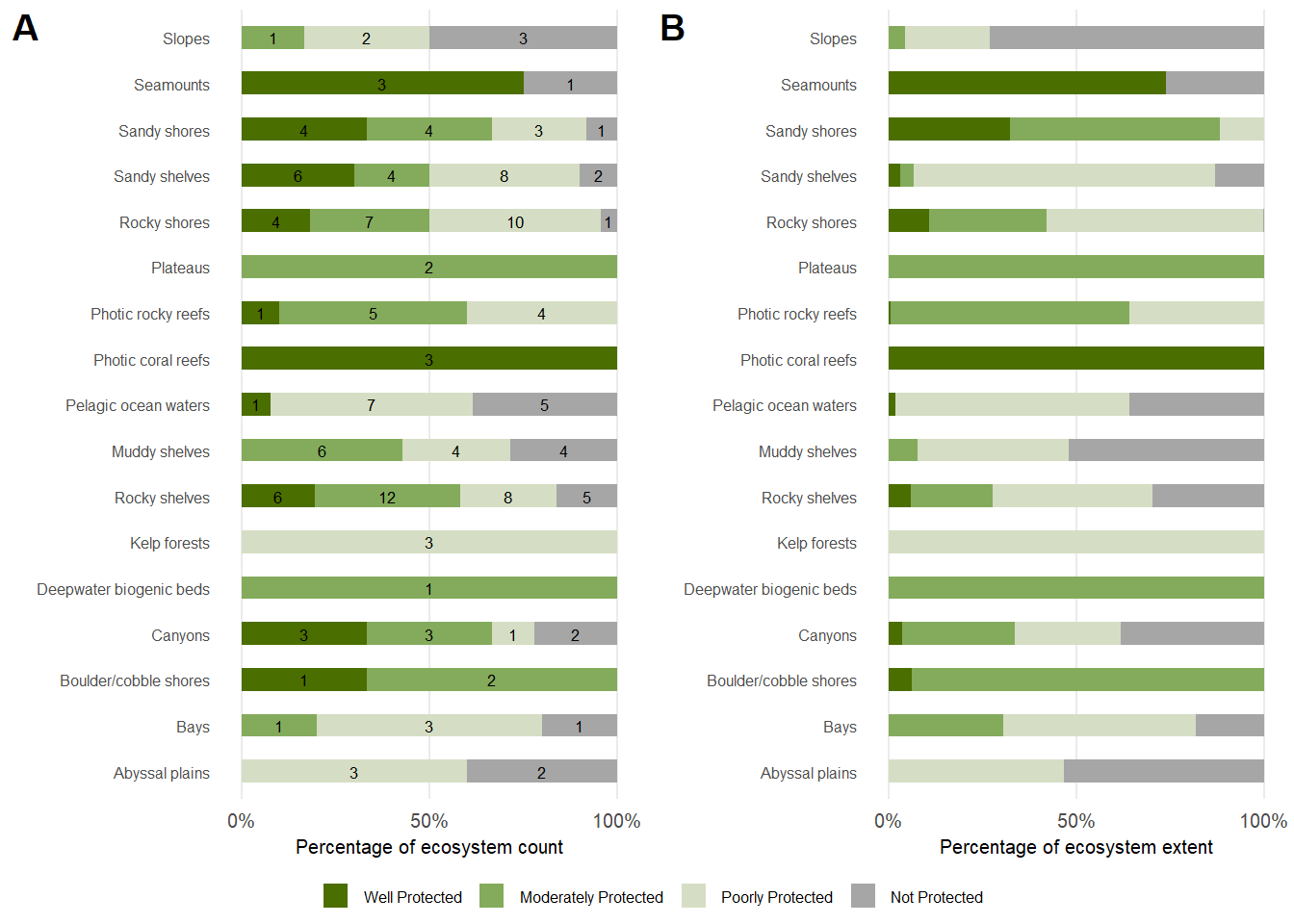 Increasing extent of protection alone will not advance marine ecosystems to Well Protected. The condition of marine ecosystems in MPAs needs improvement through collaborative efforts that more effectively address existing pressures. Furthermore, new activities that may conflict with MPA objectives should undergo thorough assessment and only proceed if they are clearly demonstrated to be compatible with conservation goals. Strengthened ecosystem management in protected areas can provide an opportunity to improve the protection level of some of the Poorly or Moderately Protected ecosystem types to Well Protected.